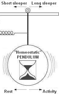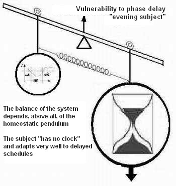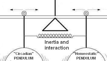 2. On the right side of the figure, the HOMEOSTATIC pendulum [3] can be compared with a simple hourglass that is turned upside down twice in 24 hours (after some time of accumulation of wakefulness or sleep). 4. The strength of the interactions between the two pendulums, and the inertia force of the whole system, determine the abilities to adapt to irregular sleep rythms.