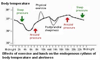 The cycle of the temperature is thus identical to that of alertness. It appears like one of the main determinants of the "gates of sleep". Therefore, the need for sleep in the evening matches a cooling down of the body. The same way, the well-known after lunch sleepiness ("postprandial") is not induced by the meal but matches a downturn of the curve of temperature around 3 PM.