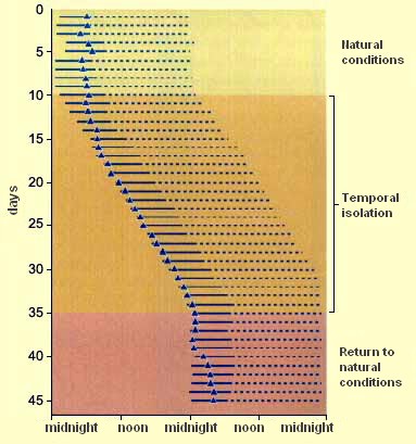 At the occasion of «out of time»experiments, all the subjects who were deprived of points of reference regarding time kept the same circadian rhythm. Without the action of the external synchronizers (Zeitgeber), the curve of the body temperature remains stable even though some subjects show a tendency to delay their sleep/wake rhythm.